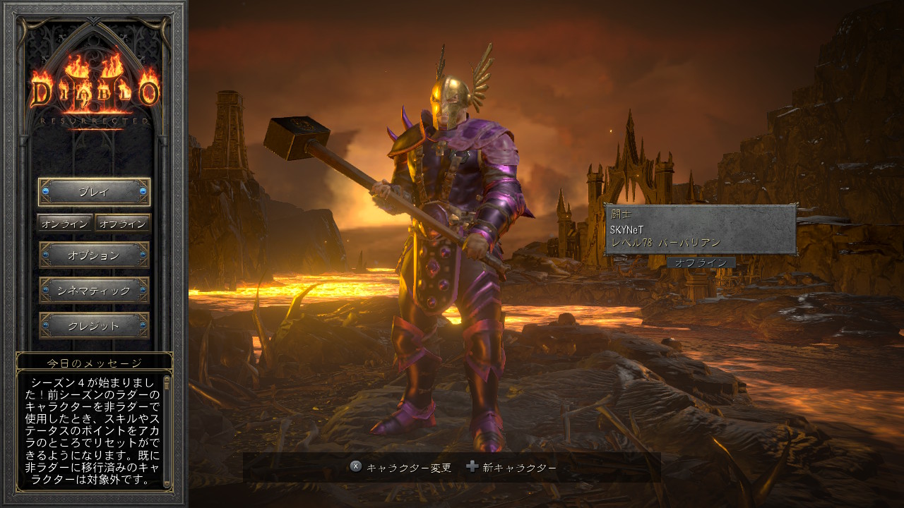 ソロ環境 D2Rでは自力で確保が必要で、ブーツとハンマーは確保したものの、IKアーマーはおろか他もなかなか落ちない。そうこうしているうちにイモキン候補生がレベル77になったので、とりあえずIKハンマーを持たせることにした。